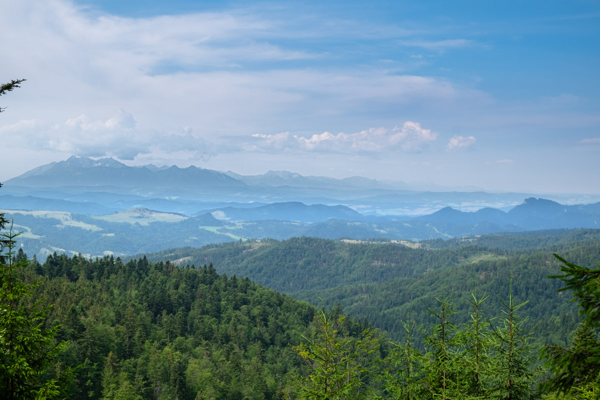 Chwilę przed szczytem Wielki Rogacz, weszliśmy w dość gęsty las, który prowadził nas leśnym korytarzem prosto do celu. Gdy nagle w drzewach pojawiły się prześwity, ujrzeliśmy majestatyczną panoramę Tatr, otulonych delikatną mgłą. Owszem, widoki do tej pory były wspaniałe, ale ten po prostu był bezbłędny. Z takiej perspektywy doskonale widać, jak masywne są Tatry w porównaniu do otaczających je wzniesień.